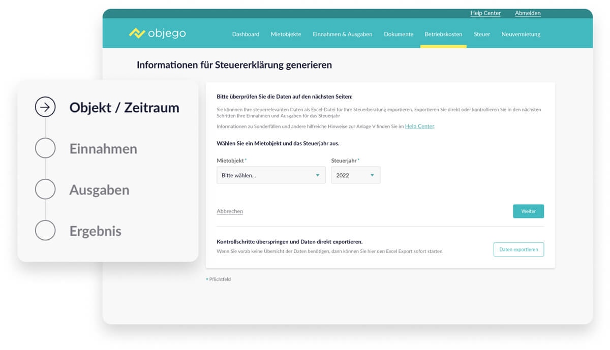 Die in objego gesammelten Daten über Einnahmen, Ausgaben und Mietverhältnisse sind relevant für die Steuererklärung, da sie in der Anlage V (Einkünfte aus Vermietung und Verpachtung) aufgeführt werden. Mithilfe von Steuerexperten hat objego einen Weg gefunden, die Vorbereitung für Sie zu vereinfachen, indem alle wichtigen Informationen in einer Excel-Tabelle aufgelistet werden.